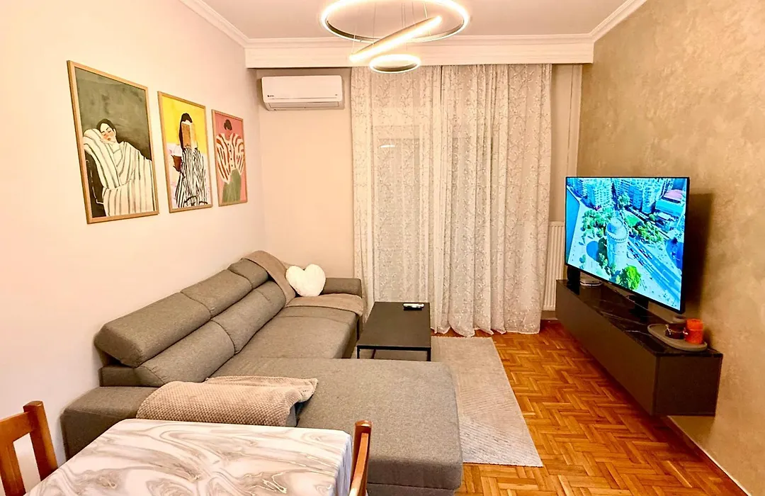 Condo In Thessaloniki, Agia Triada, di 70 m^2, offre un balcone, un bar sulla terrazza e un salottino, oltre a comfort come un impianto di climatizzazione. L'alloggio ha 2 camere da letto. La struttura comprende 1 bagno. Inoltre, troverai asciugacapelli e teli da bagno.